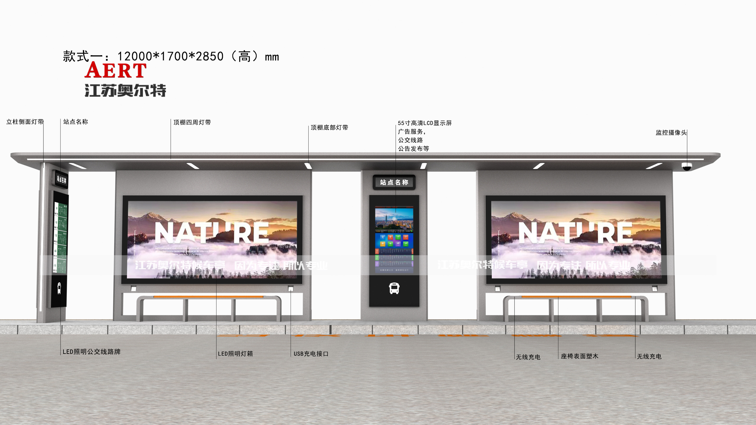 | 候車亭尺寸 | 一大一小尺寸:寬7米,高2.9米,寬1.5米 二大一小尺寸:寬12米,高2.9米,寬1.5米 三大一小尺寸:寬17米,高2.9米,寬1.5米 標準大燈箱尺寸:寬3.65米,高1.8米 標準小燈箱尺寸:寬1.2米,高1.8米 注:可根據(jù)客戶需求進行定制,采用模塊化設(shè)計,組合方式靈活多變。 |