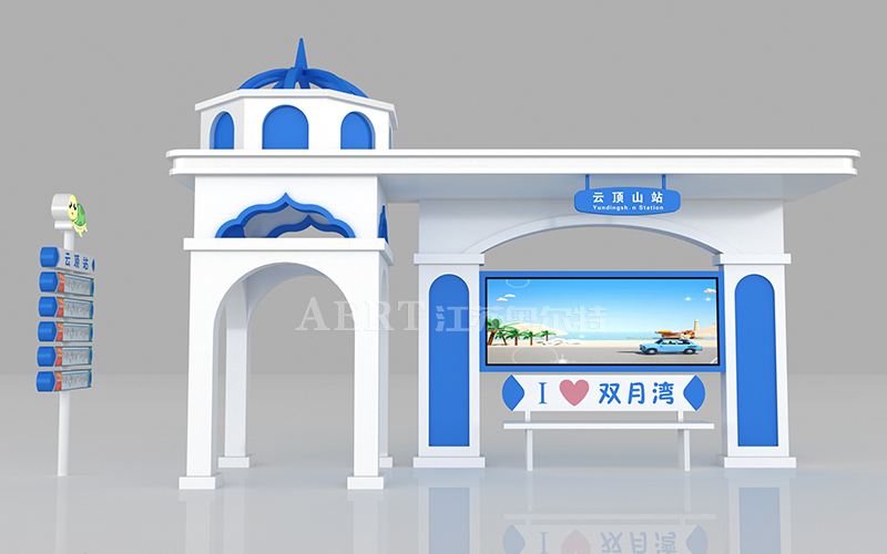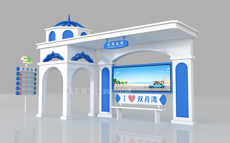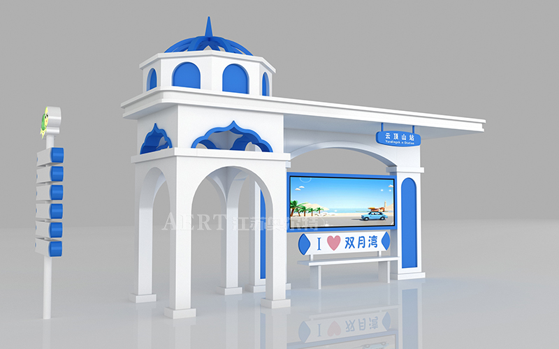 宿遷智能候車亭廠家江蘇奧爾特本次為海濱城市設(shè)計(jì)的個(gè)性化候車亭外觀采用圣托里尼的建筑風(fēng)格,色彩基礎(chǔ)是藍(lán)和白,白色的墻,藍(lán)色的頂部和門窗,