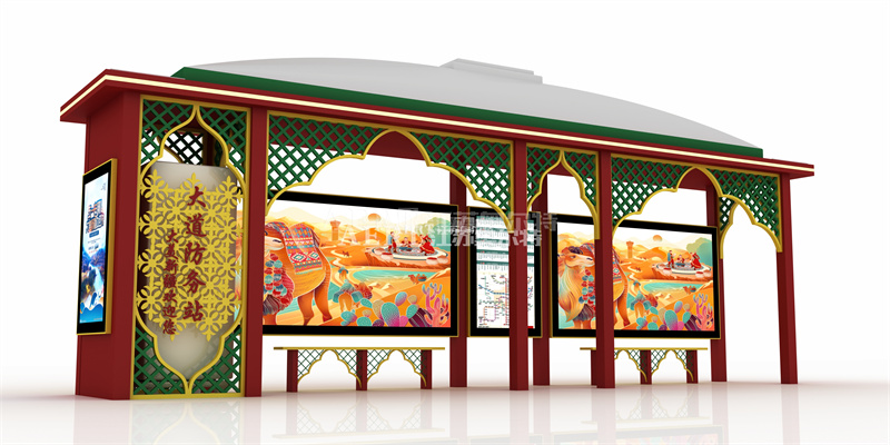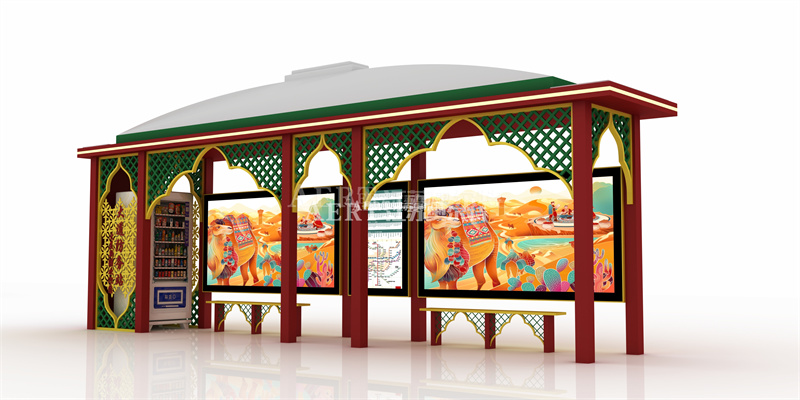 宿遷智能候車亭廠家本次為新疆大道防務(wù)站設(shè)計的一款極具新疆特色的公交站臺,造型美觀華麗,功能實用。